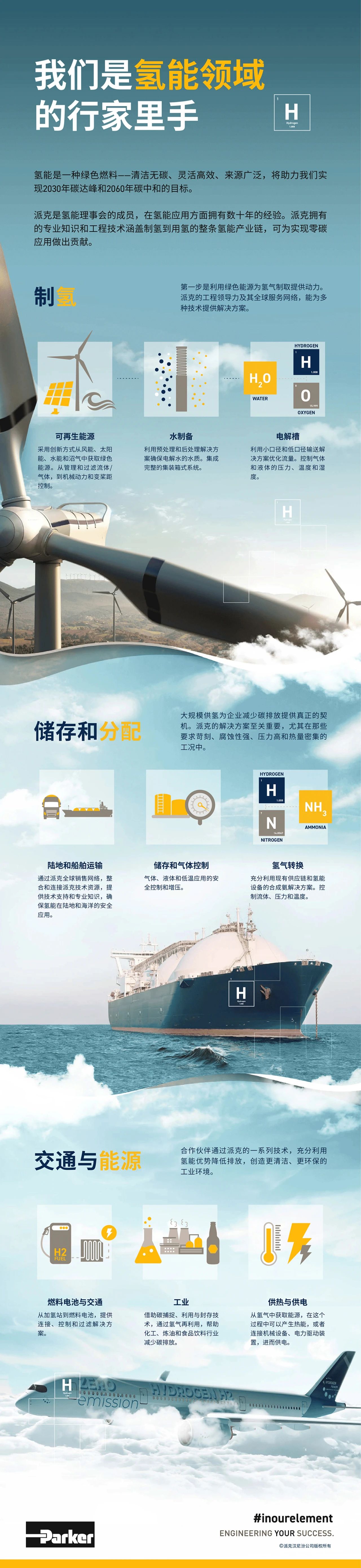 氫能是一種綠色燃料--清潔無碳、靈活高效、來源廣泛,將助力我們實現(xiàn)2030年碳達峰和2060年碳中和的目標。派克是氫能理事會的成員,在氫能應用方面擁有數(shù)十年的經(jīng)驗。派克擁有的專業(yè)知識和工程技術涵蓋制氫到用氫的整條氫能產(chǎn)業(yè)鏈,可為實現(xiàn)零碳應用做出貢獻。