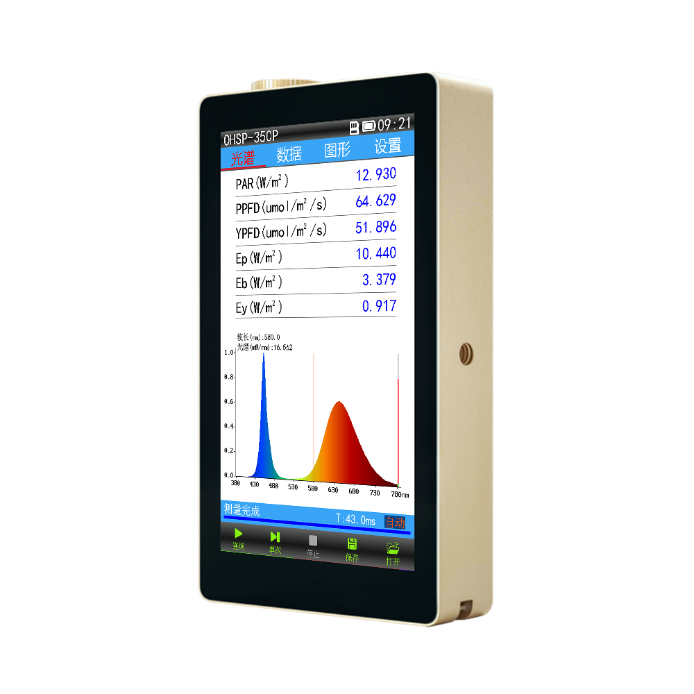 OHSP-350P集PAR 、PPFD、YPFD、葉綠素A、葉綠素B、光譜、波長(zhǎng)、色溫、顯色指數(shù)、照度、輻照度等測(cè)量功能參數(shù)于 一體。采用5英寸大屏 ,各測(cè)量參數(shù)及曲線實(shí)時(shí)顯示 ,使用 方便快捷。 可測(cè)量LED等寬光譜光源、也可以測(cè)量 LED植物生長(zhǎng)燈 ,激光植物生長(zhǎng)燈、太陽(yáng)光、高低 壓鈉燈HID等窄光譜的光源